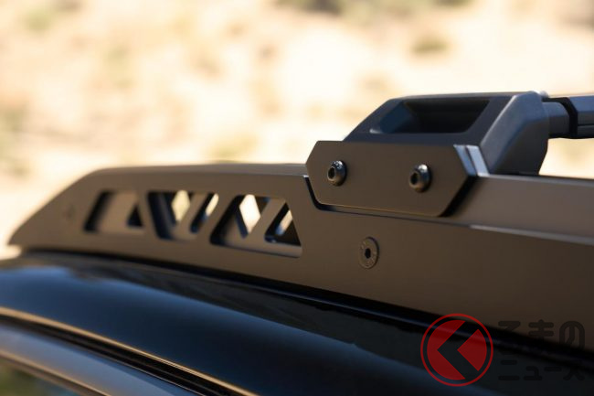 エクステリアは、専用設計のバンパーやルーフレール、オールテレーンタイヤなどを採用。モスグリーンのようなニュアンスカラーと相まってワイルドな雰囲気が醸し出されています。また、視覚的なアクセントにもなっている赤色のけん引フックは最大荷重を高めた専用設計で、機能美が感じられます。