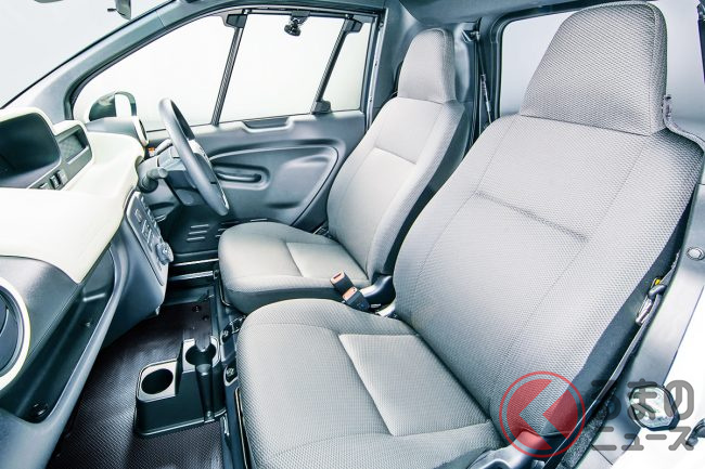 インテリアは、室内幅1100mmに抑えながら大人2人が並んで座れる空間を実現。インパネセンターにメーターや各種スイッチを配置して操作性を追求したほか、助手席オープントレイやカップホルダー2個を装備するなど、利便性も確保しています。
