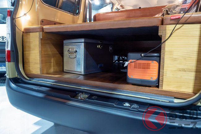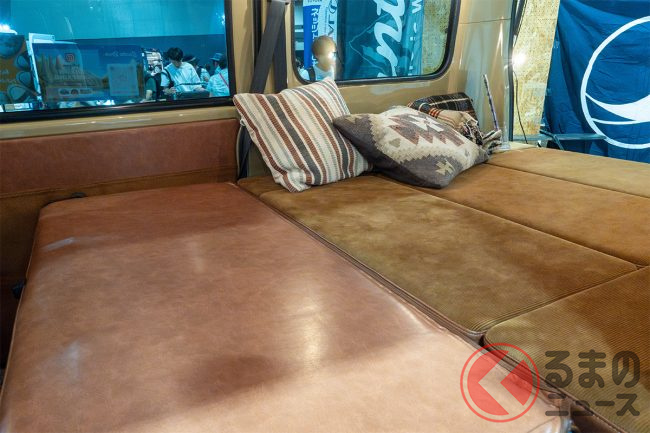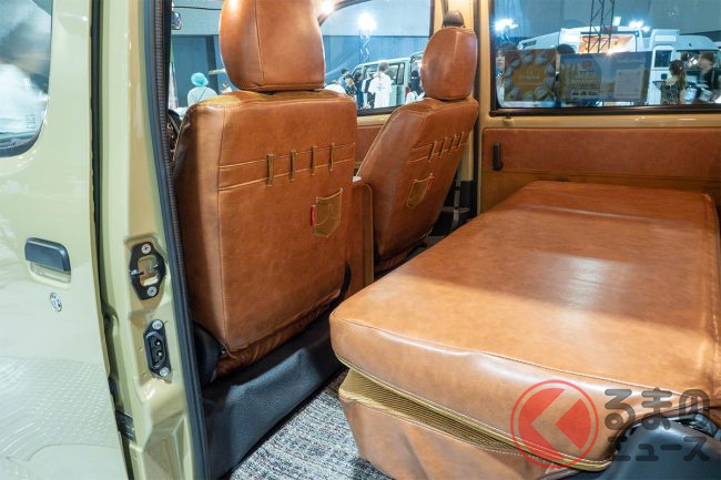 内装には、上品なブラウンのシートカバーやラゲッジのベッドキット、木目のカーゴパネルなどを装着し、外装同様にオシャレな仕上がりで、楽しく車中泊が楽しめそうです。