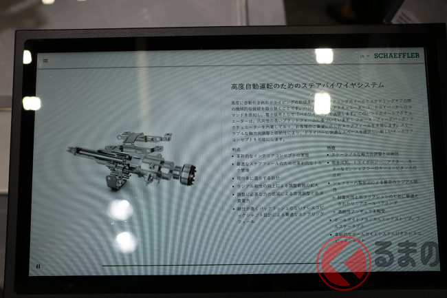 そのほかでは、将来の自動車向けのステアリングシステム「ハンドホイールアクチュエータ – プラットフォームアプローチ」などが展示されました。同製品は、ステアバイワイヤとなるのが特徴です。