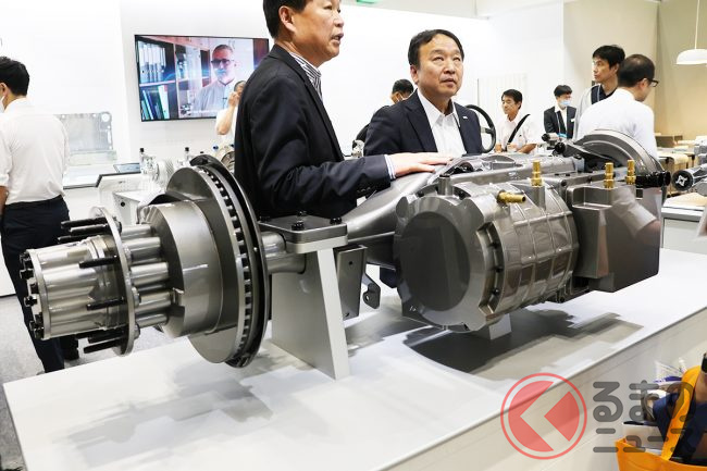 車両重量が8tほどの車両まで対応できる設計で、本体の中央部に220kW出力のモーターを内蔵しています。大きなバッテリーを搭載すれば、電動トラックに早変わりしますが、技術者によれば、ハイブリッドカーに活用するのが理想的ではないかとのこと。荷物積載やエネルギー効率を考えると、大きなバッテリーは、トラックとしての機能をスポイルすることになります。