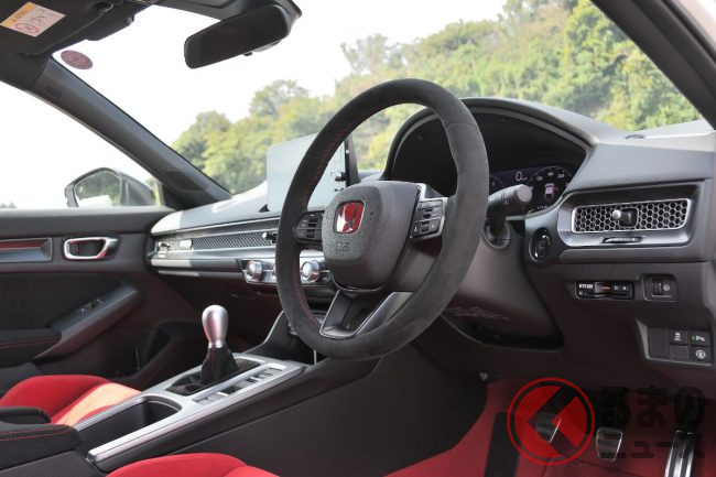 インテリアはタイプR専用の赤いバケットシートやフロアカーペットが採用され、アルミ削り出しシフトノブなどにより独特のレーシーな雰囲気を演出しています。