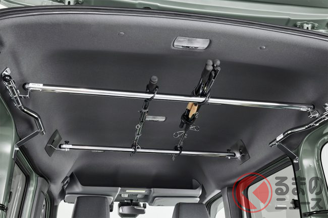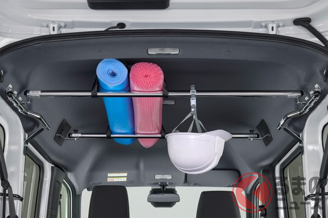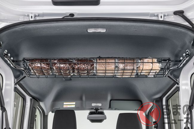 内装では、新型N-VAN e:の広大な荷室空間をさらに便利に活用するためのアイテムとして「メッシュポケット」や、荷室上部のデッドスペースを活用する「クロスバー」、ルーフサイドを活用する「ルーフインナーラック」などを用意。