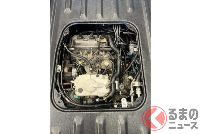 荷台下部のエンジンルーム内は経年なりの汚れが見られますが、サビなどは少なく、これまで良好な環境で使用されてきたようです。