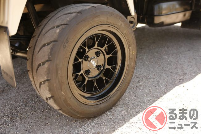 さらに、ホイールは13インチの「ABR」製ホイールに履き替えられ、タイヤはトーヨー「プロクセス R888-R」とモータースポーツ用のハイグリップタイヤを装着。