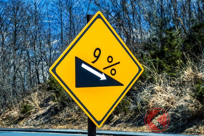 急な下り坂ではアクセルオフにして、低速ギヤに落として惰性運転で坂道を下ります。