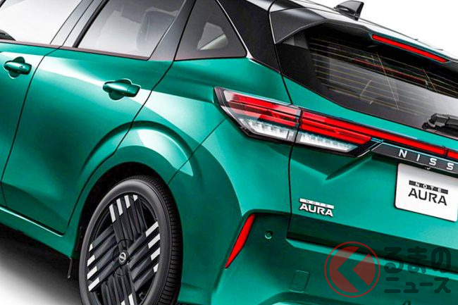 日産“新型”「高級ノート」初公開! 迫力顔&上質内装の「小さな高級車」! オシャグリーンも超カッコイイ「オーラ」に販売店でも反響集まる