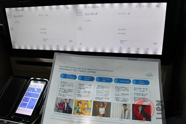 実際に運転席に座りながら、新旧の邦楽、洋楽をメティオサウンドで試聴体験することができました。車内にいながら、上から音が鳴って降り注いでくるような音響空間は、これまでに味わったことのない新鮮な感覚です。