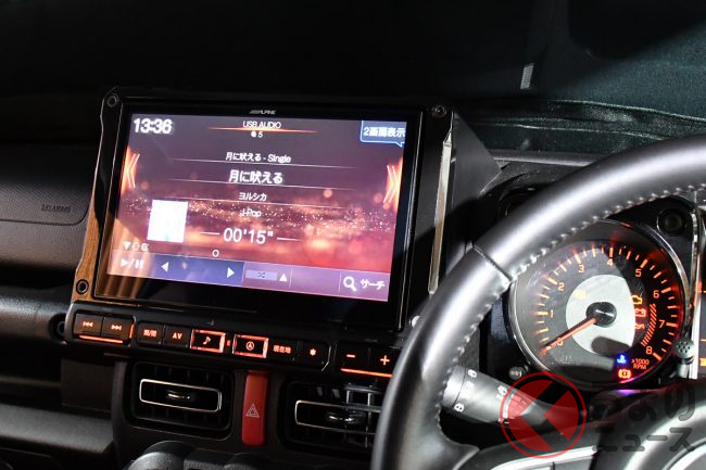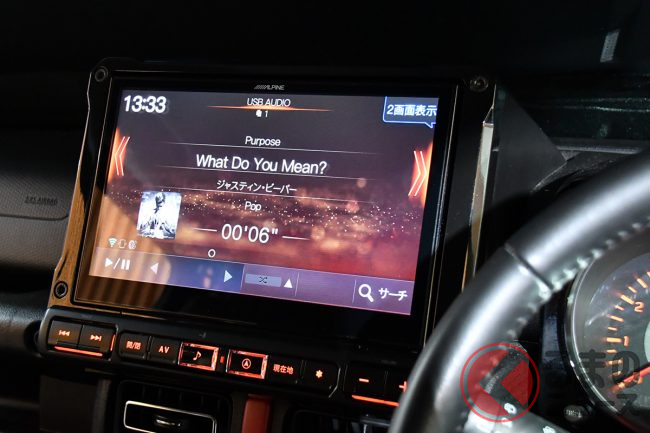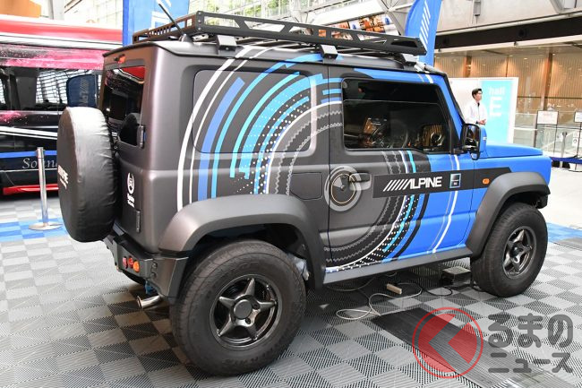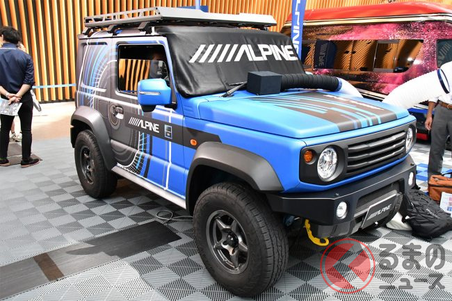 アルパインは、ルーフスピーカーから降り注ぐサウンドと、ドアスピーカーから鳴り響く重低音を実現するというサウンドシステム「MetioSound(メティオサウンド)」に加えて、専用の10型ビルトインナビ「BIG X」が組み合わされたスズキ ジムニーシエラのデモカーを展示していました。