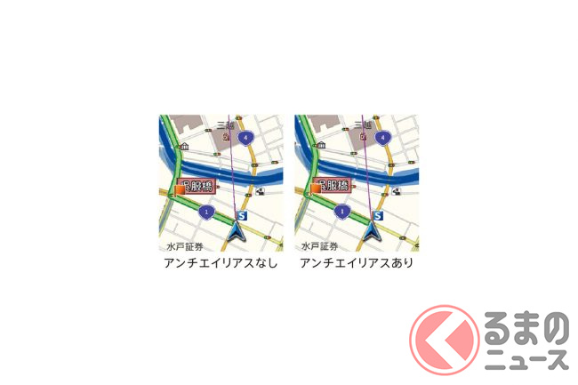 さらに、表示画面の切り替えや動画再生中のカーナビゲーション操作などの高負荷な処理にもスムーズに対応。フリックやピンチイン・アウトなど、スマートフォンのような操作も可能となっています。アンチエイリアス対応により、地図のルート線や目的地直線を滑らかに描画し、地図の見やすさも向上しているとのことです。
