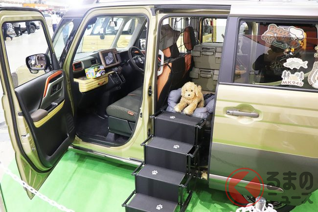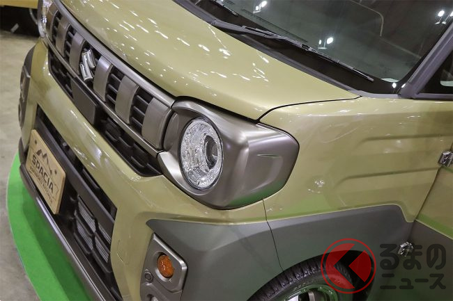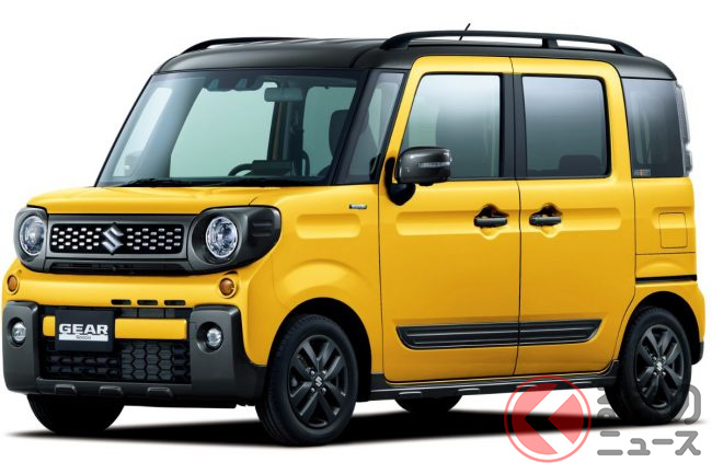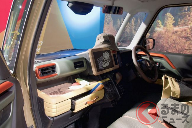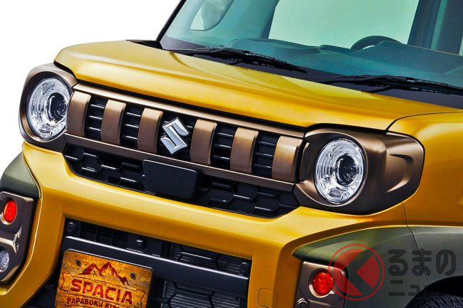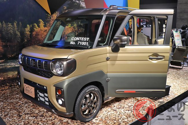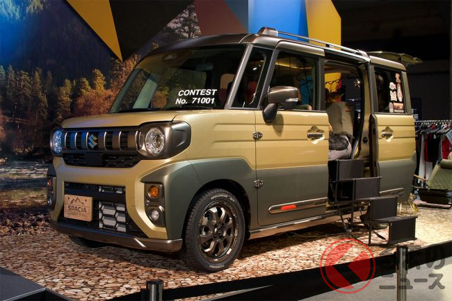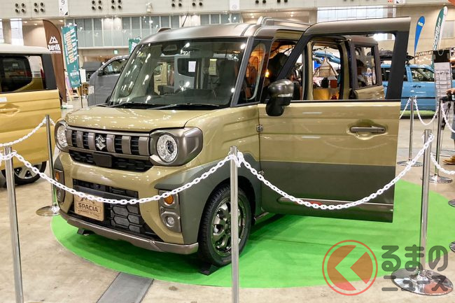スズキが「本格“軽”SUV」実車公開! 次期「スペーシアギア」!? 超カッコイイ「“ジムニー”顔」&「斬新内装」のアウトドアカスタムお披露目
