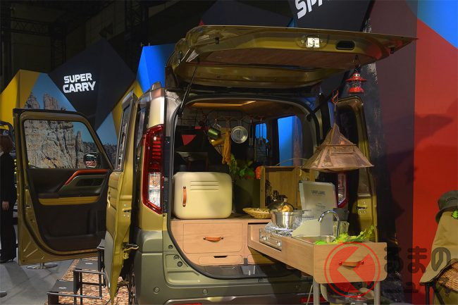 荷室にキッチンスペースを備え、「料理で親子のコミュニケーションが弾むファミリーキャンプの世界観を表現した」とスズキは説明します。