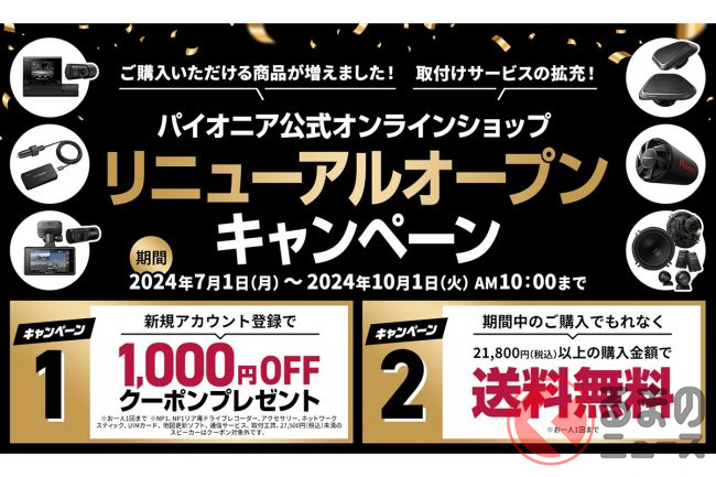 また、リニューアルオープンを記念して2024年7月1日から同年10月1日まで、パイオニア公式オンラインショップの新規アカウント登録を行うと1000円OFFのクーポンがプレゼントされるキャンペーンと、2万1800円(消費税込み)以上の購入で送料が無料となるキャンペーンが開催されます。
