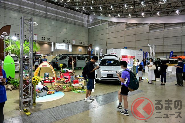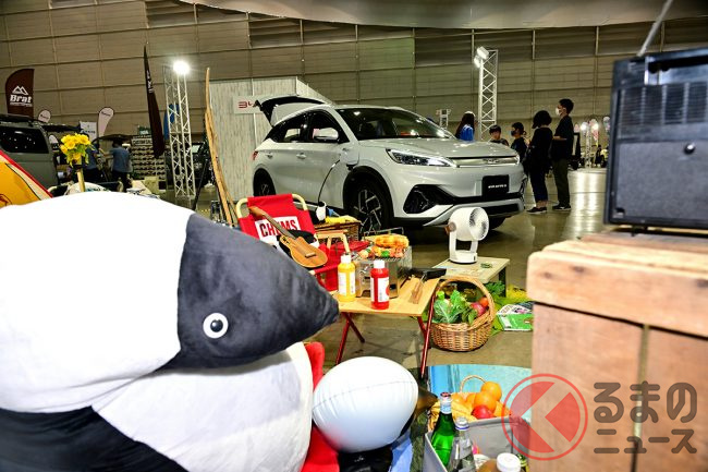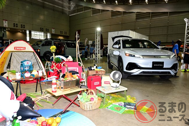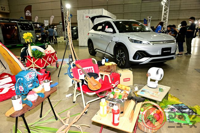 2024年6月28日から30日まで、幕張メッセ(千葉市)で東京アウトドアショー2024が開催されました。夏のビーチをイメージしたBYDブースでは、同社の電気自動車「ATTO 3(アットスリー)」のアウトドアでの楽しみ方を提案していました。