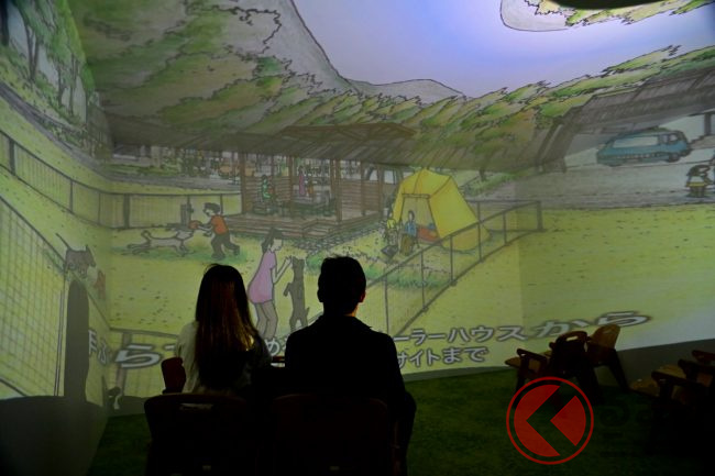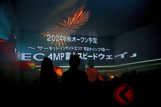 そんな非日常空間を一足早く“体験”できるように、東京アウトドアショー2024のブースでは、壁や天井など360度映像で「RECAMP 富士スピードウェイ」を鑑賞できるスペースも用意していました。その雰囲気はまさに富士スピードウェイにいるかのようでした。