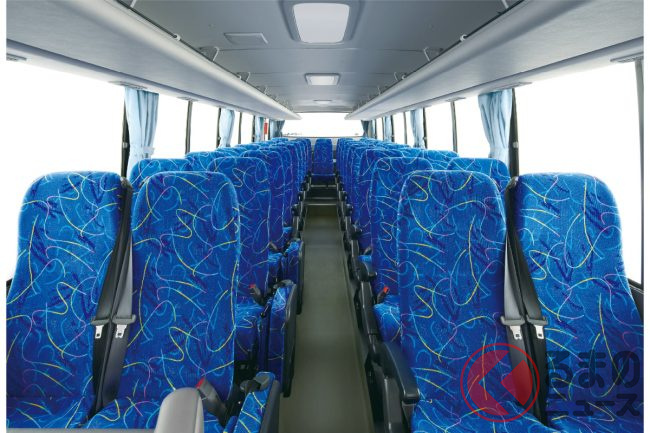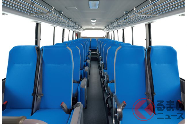 ラインナップは45人乗り9列シートのベーシックモデル「M-I」、フルモケット張りリクライニングシートなどを備える41人乗りの中級タイプ「M-II」、スイング式前扉やテレビなどを備える8列35人乗りの最上級モデル「M-III」を用意。