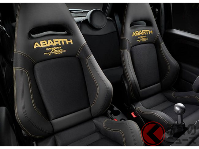 そのほか、695シリーズ最後のモデルらしく数多くの特別アイテムが採用され、ヘッドレスト一体型専用スポーツシート(Sabelt製)、17インチ14スポークアルミホイール(ゴールド塗装)、専用エンブレム、ABARTHサイドストライプおよびスコーピオンルーフデカール(ゴールド)などが標準装備されます。
