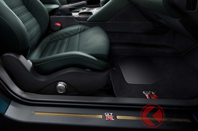 エクステリアには通常より広いフロントフェンダーを装着。その他、機能面では「GT-R NISMO カーボンセラミックブレーキ」や金塗装バージョンの「NISMO RAYS 20インチホイール」を採用しています。インテリアには専用カラーのモスグリーンを使用しました。