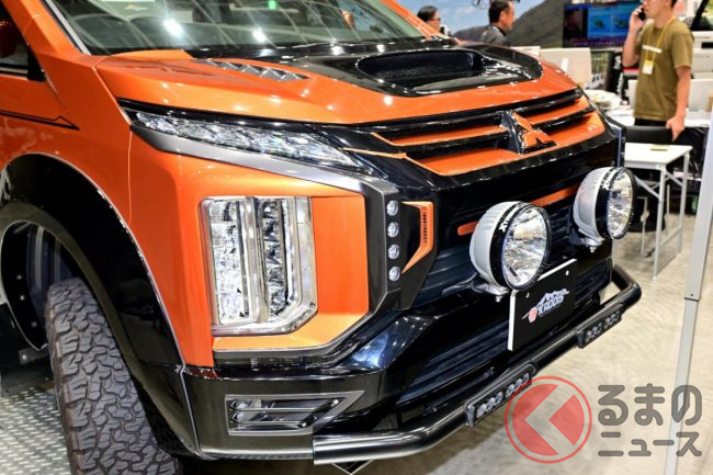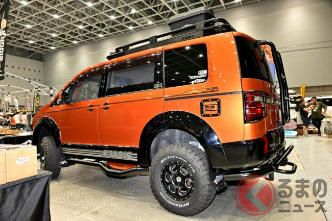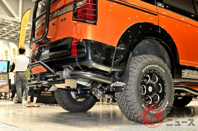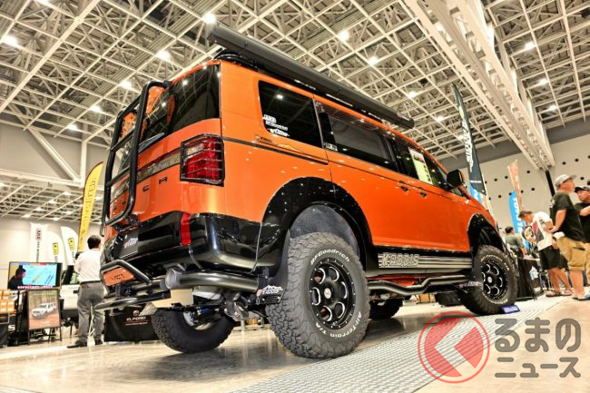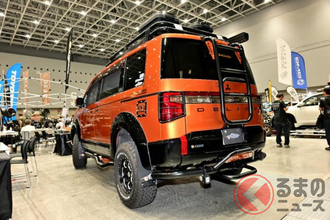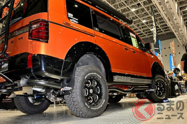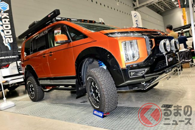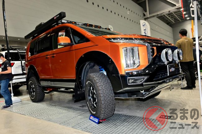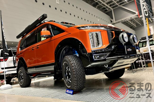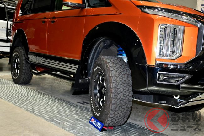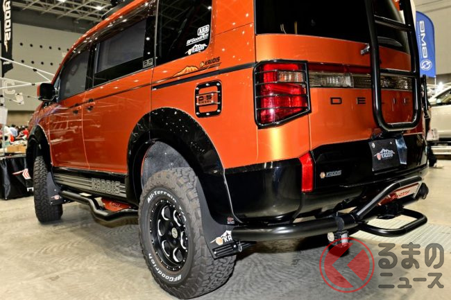 SUV顔負け! 三菱の斬新「オフロードミニバン」実車公開! 巨大タイヤ&“10cm超”リフトアップ! “めちゃタフ仕様”な「デリカD:5」登場!