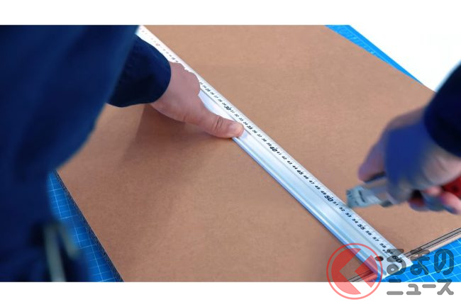 そして定規とカッターを用意してダンボールを切断し、接着剤で複数枚貼り合わせていきます。