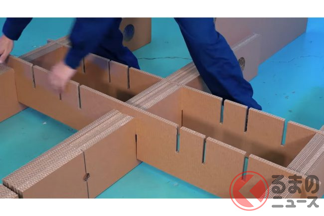 動画では段ボールで出来たクロスオーバー(以下段ボールクロスオーバー)が出来上がる様子がわかります。