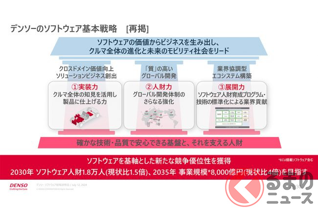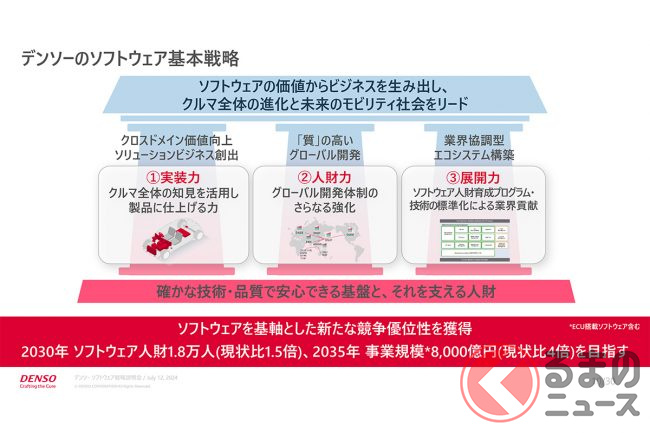 そのなかでデンソーは、今後の基本戦略として総合システムメーカーならではの知見でモビリティ社会全体の安全と環境に貢献するために「実装力」「人財力」「展開力」という3つのテーマを掲げ、2030年にソフトウェア人財を1.8万人へ(現状比1.5倍)、2035年にはECU搭載分を含むソフトウェア関連の事業規模8000億円(現状比4倍)を目指すとしています。