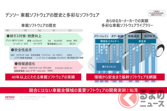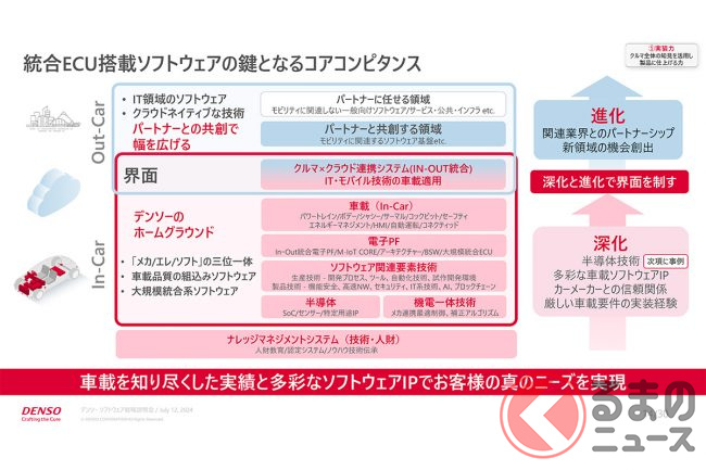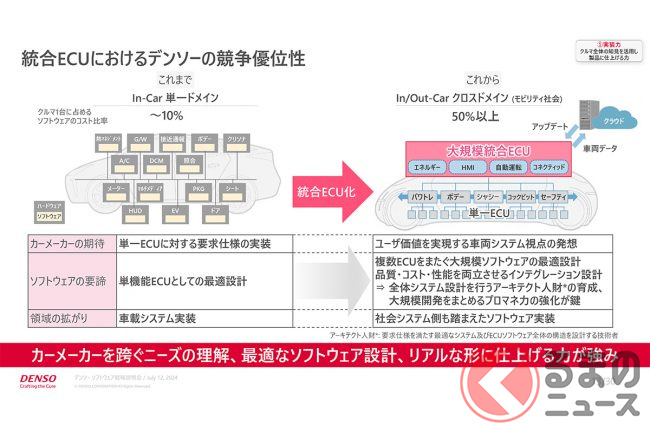 デンソーには、過去40年にわたる車載ソフトウェアの開発実績と、パワートレインやエアコンなどの環境機能から安全機能に至る車載全領域の開発知見の土台があるといいます。またそれらの知見から、従来は10%ほどだったクルマ1台あたりにおけるソフトウェアのコスト比率が、今後は50%以上を占めるようになると予測。これは、個別に車載されていた各ドメインが、クラウド化も含めた大規模統合ECUに集約されることによる比率上昇とのことです。