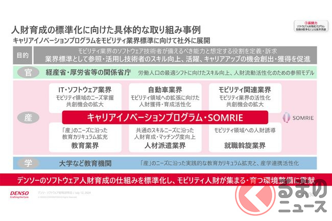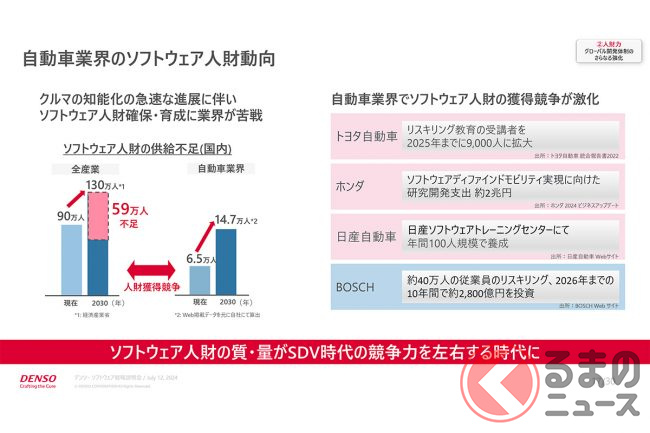 増大する開発工数に伴って、ソフトウェアの開発に携わる人材確保と育成に自動車業界全体が苦戦しており、業界内での人財獲得競争が激化しているとのことです。そのなかでデンソーは、2030年までにソフトウェアの開発量自体が3倍になると予測し、仕事のやり方改革や効率化を進めることで、1.5倍規模の人財の範囲でその業務量を賄い、ソフトウェア事業規模を現状の4倍にすることを目指すとしています。
