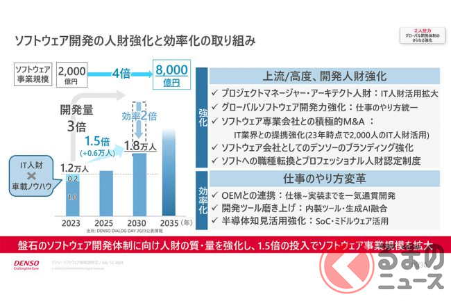デンソーのソフトウェア戦略説明会が都内で開催され、現状と比較して、2030年までに人財1.5倍、2035年までに事業規模4倍を目指すための戦略について説明がありました。