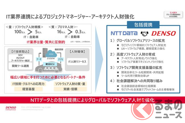 またIT業界と比較して、自動車業界はソフトウェア人財の規模や“プロマネ人財”(プロジェクトマネージャーを担える質)ともに圧倒されていると分析しており、NTTデータとの包括提携によりソフトウェア人財を強化するとともに、開発拠点も新橋、日本橋室町、羽田など都心拠点を増やしていると説明しました。