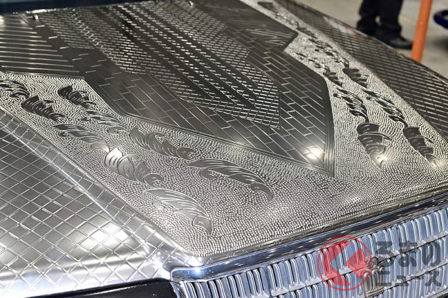 とくにアラベスク模様をボディ全体に彫り込んでいくのは時間が掛かったとのこと。ボンネットにある葉っぱのような模様の横にある丸の彫刻だけでも丸1日掛かったといいます。