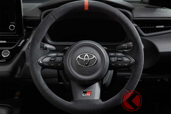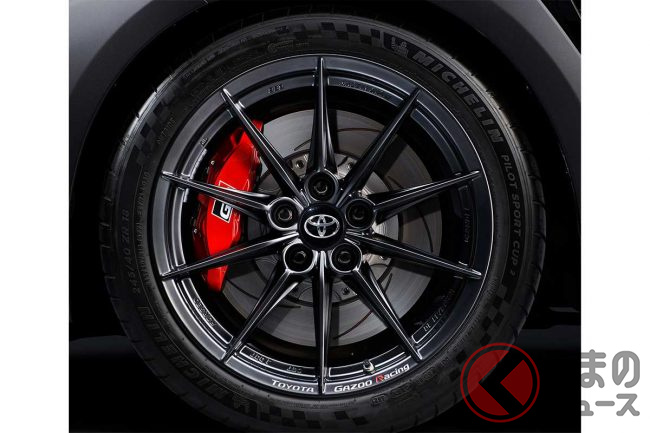 GRカローラは、ベースの5ドアハッチバック「カローラスポーツ」に対してフロントを60mm、リヤを85mmワイドトレッド化し、幅太のハイグリップタイヤ(235/40R18ヨコハマADVAN APEX V601)を装着しています。
