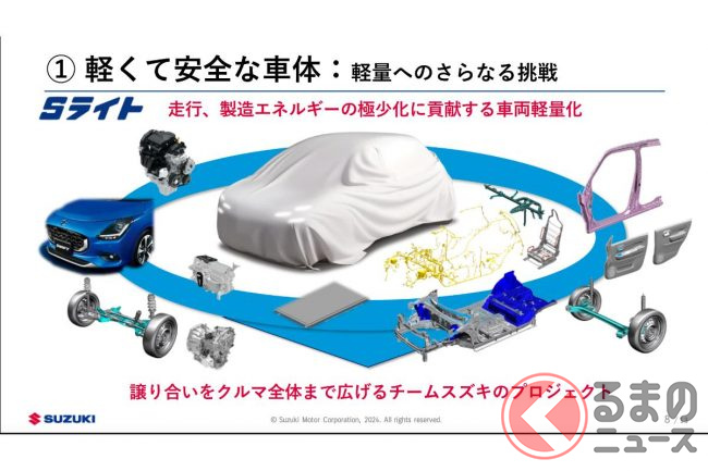 スズキが発表した「10年先を見据えた技術戦略」は、「軽くて安全な車体」、「バッテリーリーンなBEV(バッテリーEV)/HEV(ハイブリッドEV)」、「効率良いICE、CNF技術」、「SDV(Software Defined Vehicle)ライト」、「リサイクルしやすい易分解設計」の5項目に分かれます。