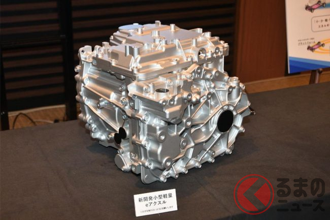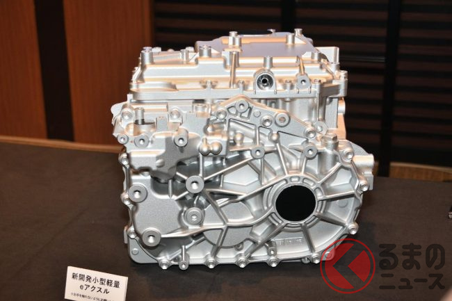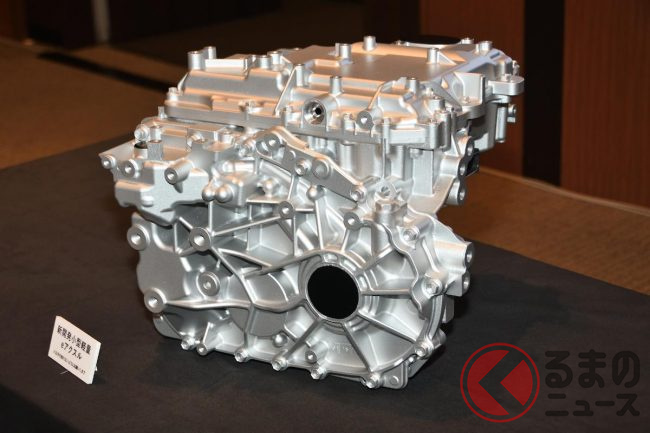 今回の記者会見では同時に、実際に開発中だという新型モーターが初公開されました。同モーターはフロントに搭載することを前提とされたもので、基本的にはFFの駆動方式を考えているといいますが、ドライブシャフトをつなげることで、後輪駆動にすることも4WDにすることも可能だといいます。