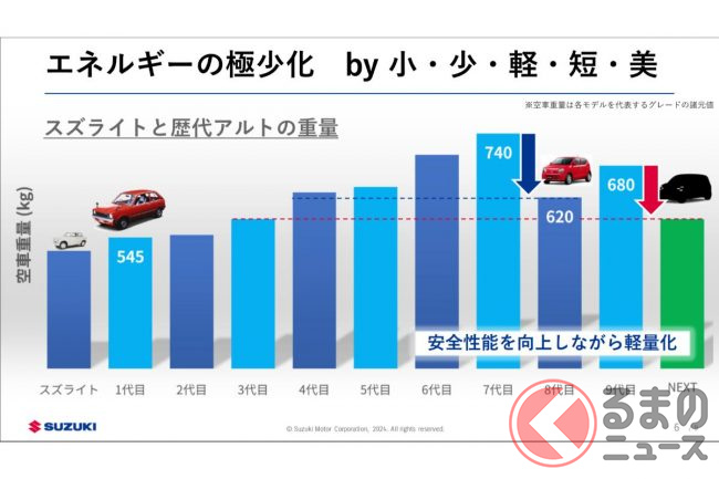 スズキの初代アルト(車両重量545kg)から7代目アルトまでは、規格や法改正への対応など要求に応じて重量が増えてきましたが、8代目アルトで、全社で軽量化に取り組み、団結と譲り合いで安全性能を向上しながら120Kg軽い、4代前のアルトの重量レベルに仕立て上げることができました。これが今からちょうど10年前です」