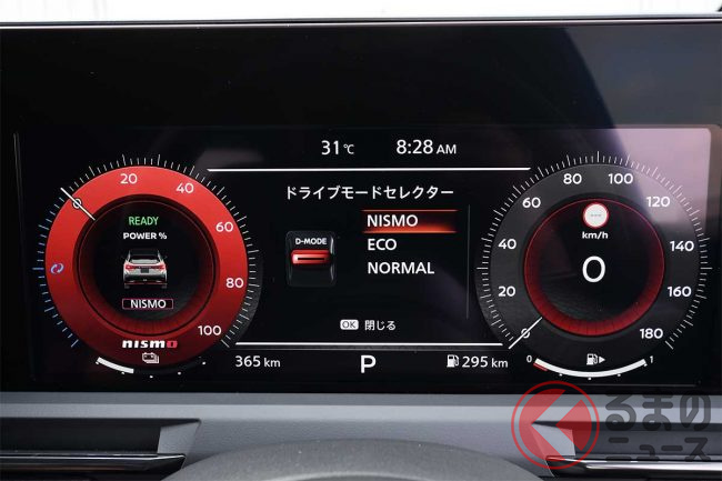 ドライブモードはECO、Normal、NISMOの3種類が用意されており、オーラNISMOのECOモードは、標準のオーラのSPORTモードと同等の走行性能を持っています。