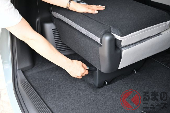 さらに裏側を薄型化したことで、格納時の張り出しも薄くなって、荷室幅が従来より160mmも広く使えるようになっています。その効果はとくに、自転車など高さのある大きな荷物を積む際に引っ掛からずスムーズにすべらせることができたり、ラゲッジのフロアに置いたクーラーボックスなども、いちいち降ろすことなく開閉できるようになったりと、グンと使いやすくなっています。