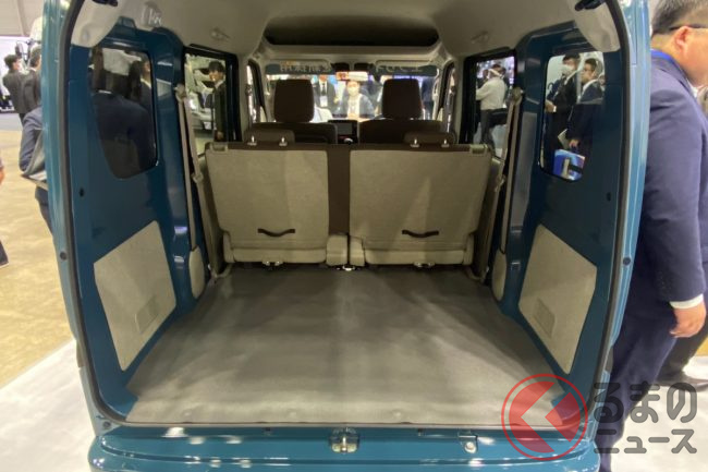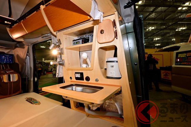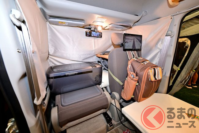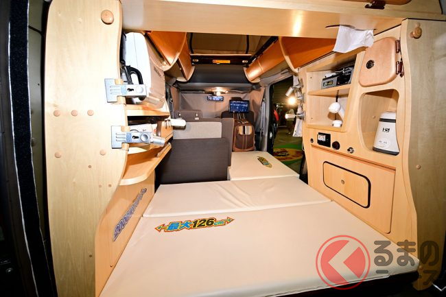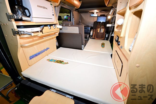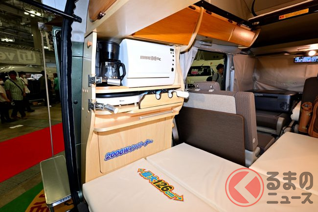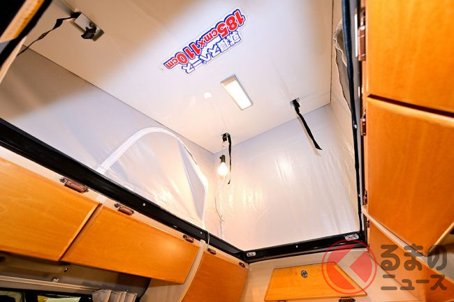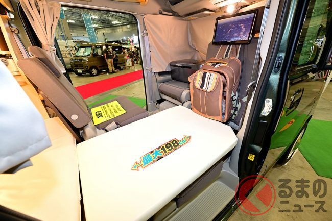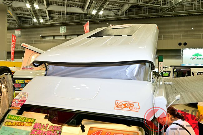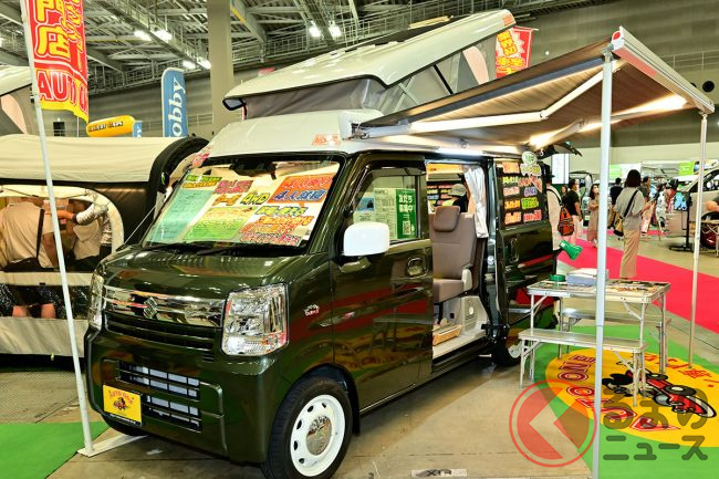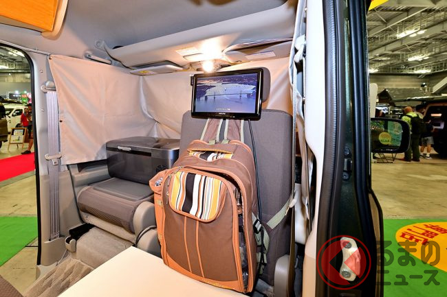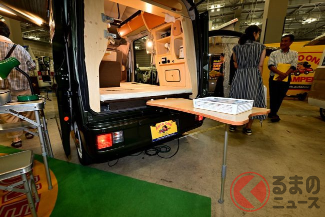 「車内で立てる!」めちゃ広い「軽バン」実車展示!“開く屋根”採用で4人が寝られる! 家電も使用可能な「軽キャンパー」がスゴい