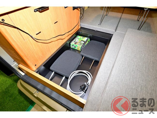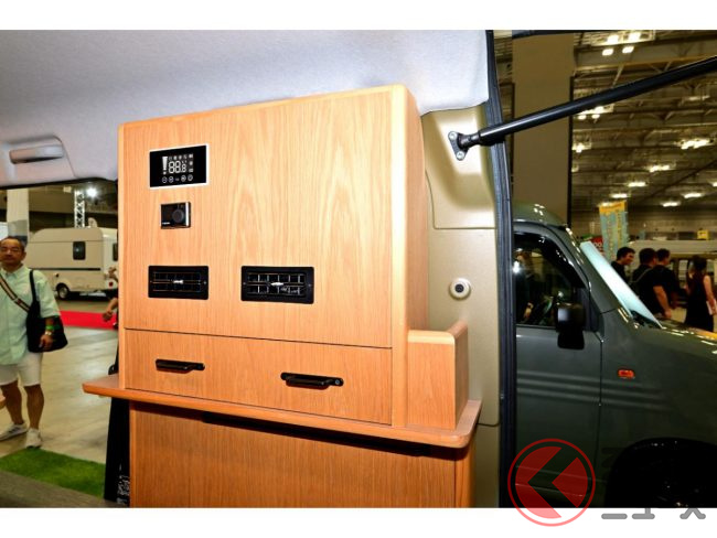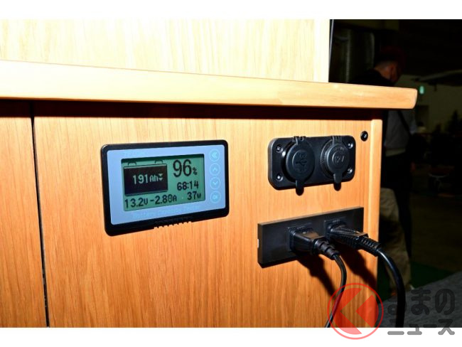 この空調に使用する電源類として、200Ahリン酸鉄リチウムイオン電池を搭載するほか、1000Wインバーターも標準装備。