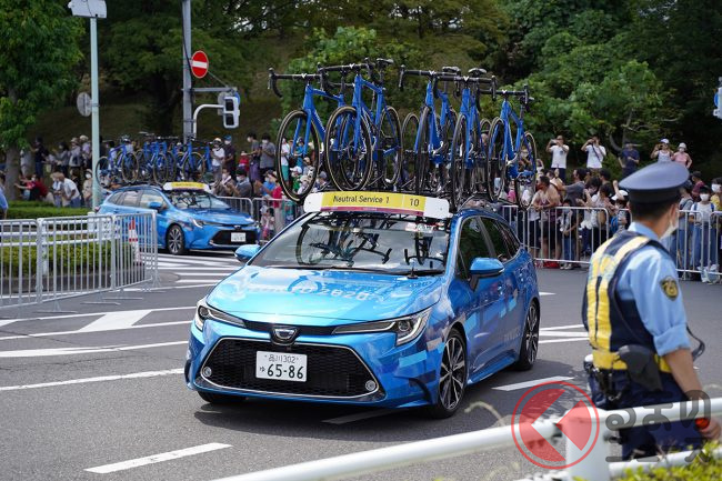 世界の強豪選手が全力で郊外路や山道を駆け抜けるなか、その後方では各チームのサポート車両が数十台の単位で追走するシーンが印象的でした。