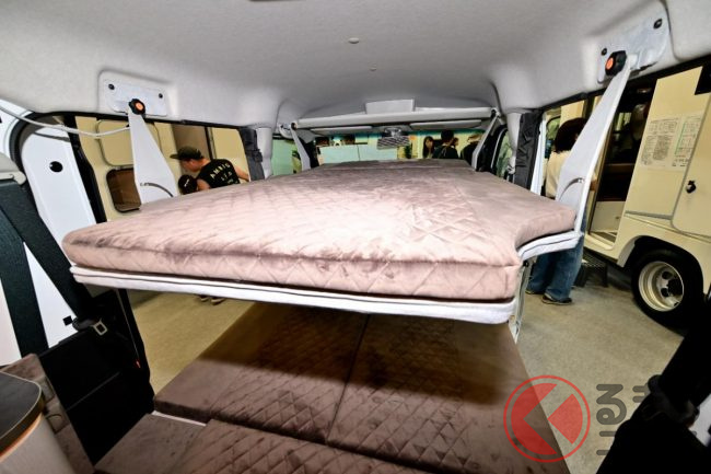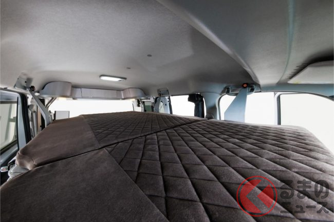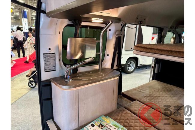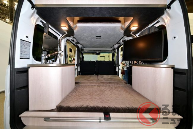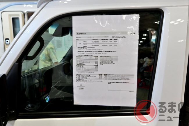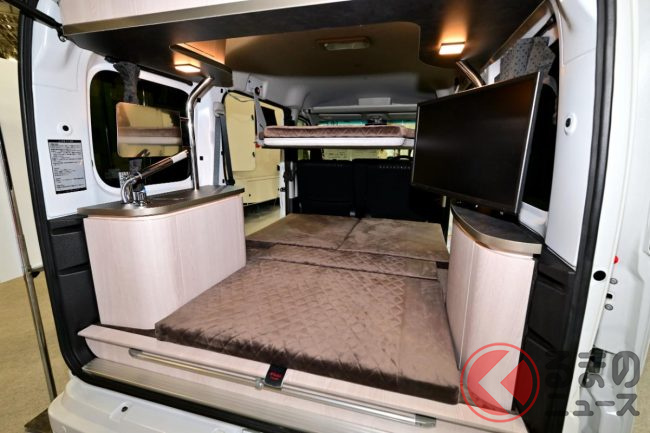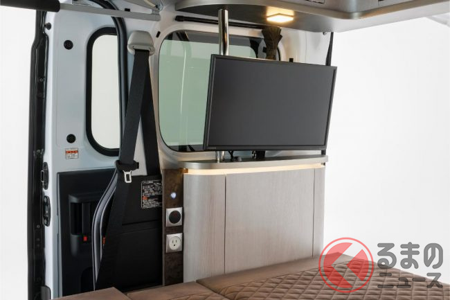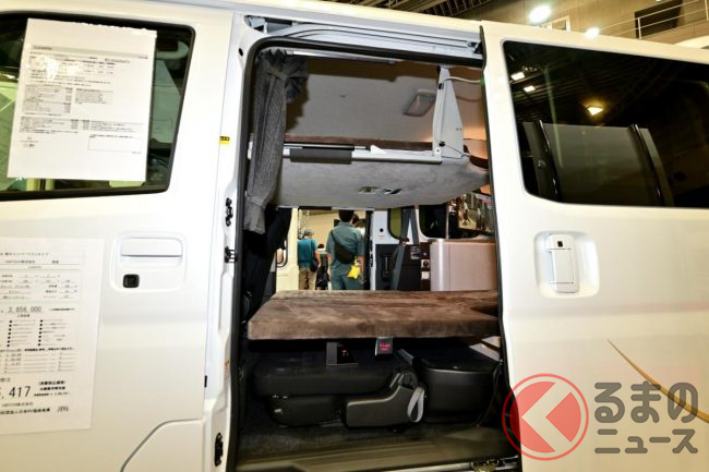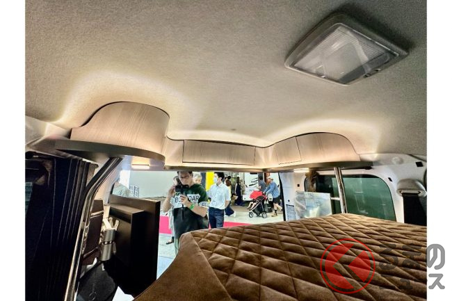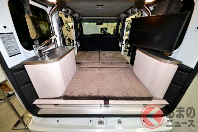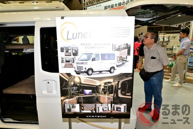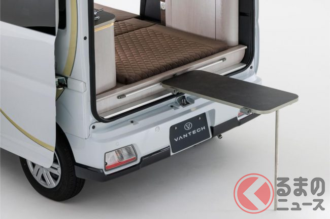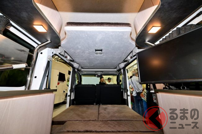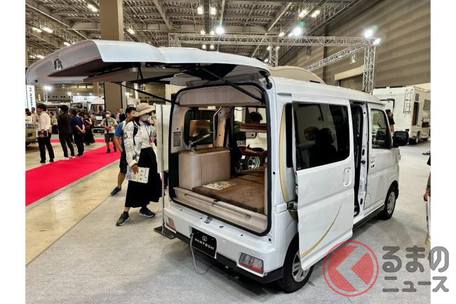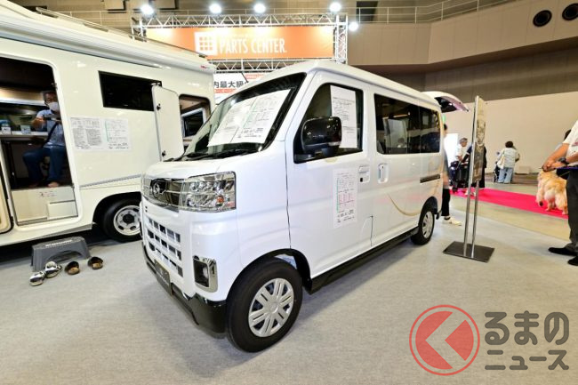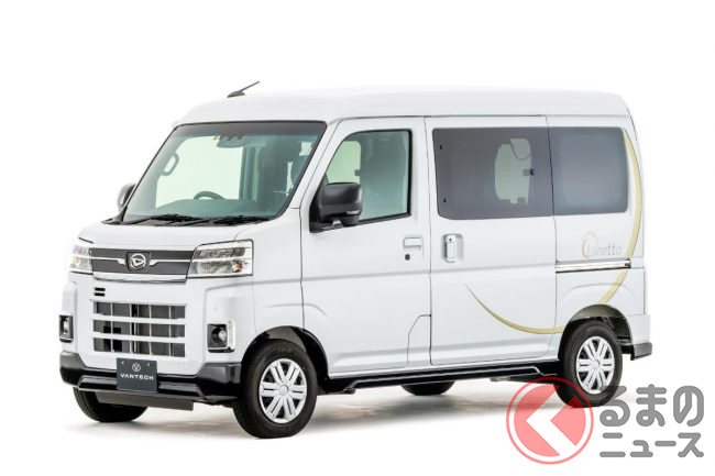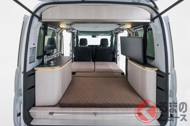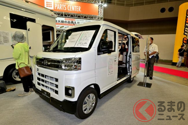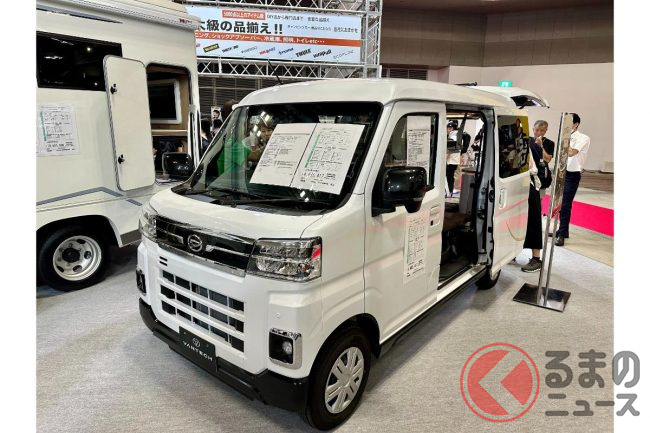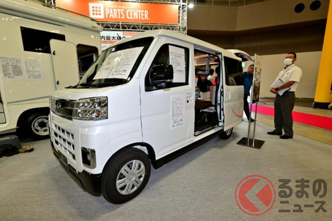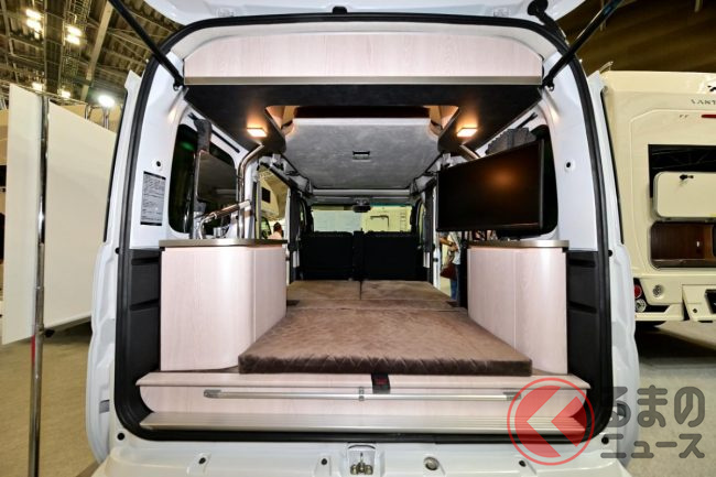 ダイハツ「新・軽バン」初公開! 驚愕「大人2人」寝れる! オジサン歓喜な車中泊仕様!? 注目の新型「ルネッタ」展示