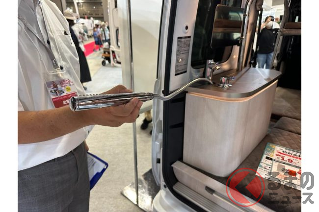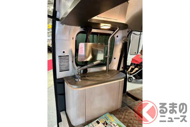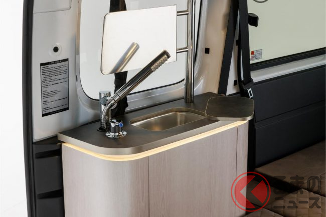 外部シャワーとして使えるシンクの蛇口や、車両後部に装着する脱着式マルチテーブルがオートキャンプでの利便性を向上させています。