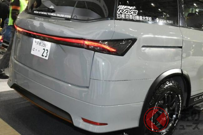 この車両は現行エルグランドをベースに、フロント周りには最新の「エクストレイル」のフェイスを移植したのに加えて、バックドアとウィングには「アリア」の部品を使用。