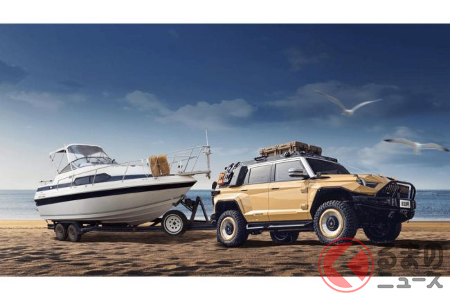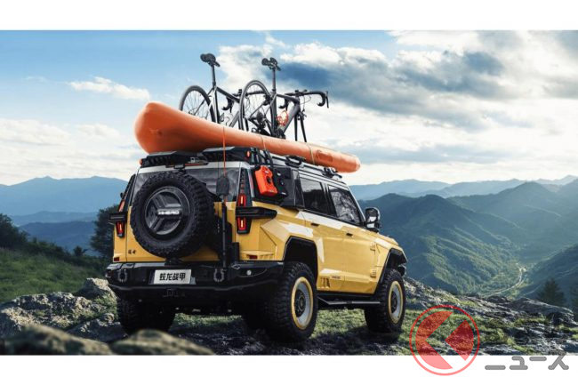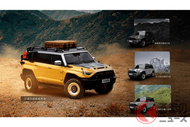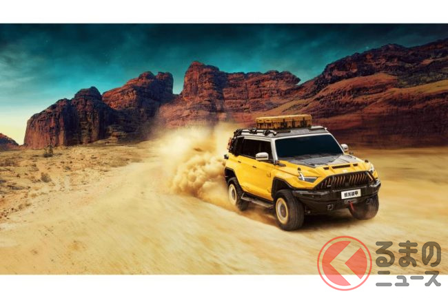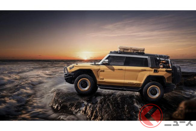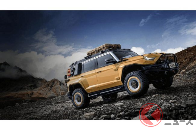 ベースになっているのは「猛士917」という電動SUV。ボディサイズは全長4987mm×全幅2080mm×全高1935mm。外観はレトロさとSF感が調和した箱形のデザインをして、いかにもオフローダーといった雰囲気です。