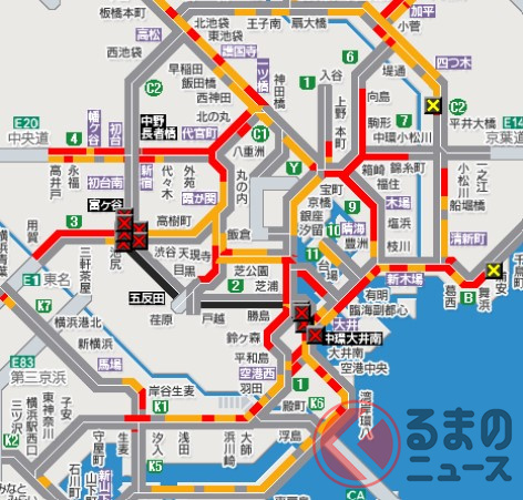 首都高の情報によると、通行止めが発生したのは8時39分ごろ。大井JCT~西新宿~熊野町JCTの広い範囲です。