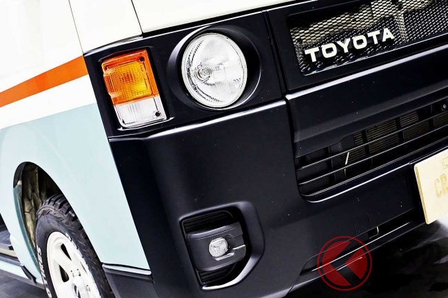 フロント周りは、ハイエースやランドクルーザーのカスタムを得意とするフレックスドリームとコラボしたもので、丸目フェイスキットやアルミホイール&タイヤセット「FD-classic」が使用されています