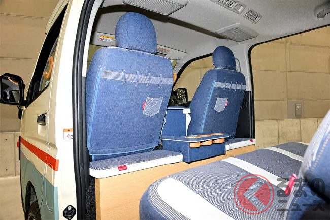後席には白いラインがアクセントのストライプ調のシートカバーがセレクトされ、荷室側に回るとデニムの生地があしらわれたベッドキット、サイドには木製のキャビネットが備わります。