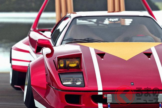 フェラーリ「F40」を“街道レーサー”化!? 6本出し竹槍マフラー+デッパ装備で「“億超え”チバラギ仕様」! 非現実的すぎるCGが超カッコイイ