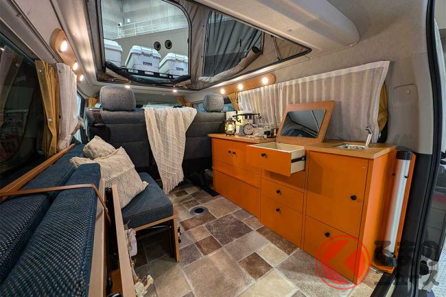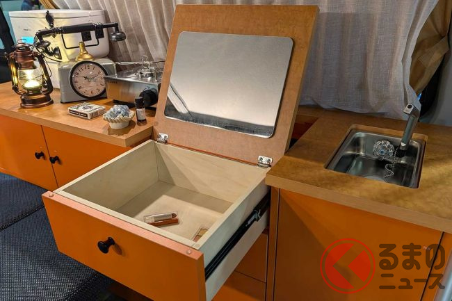 装備も充実しており、スライド式の鏡付きコンパクトドレッサーやポータブル電源に対応した電気設備、ステンレスシンク、コンロなどが機能的にレイアウト。2段ベッドやクーラー、FFヒーターなどもオプションで装着可能だといいます。