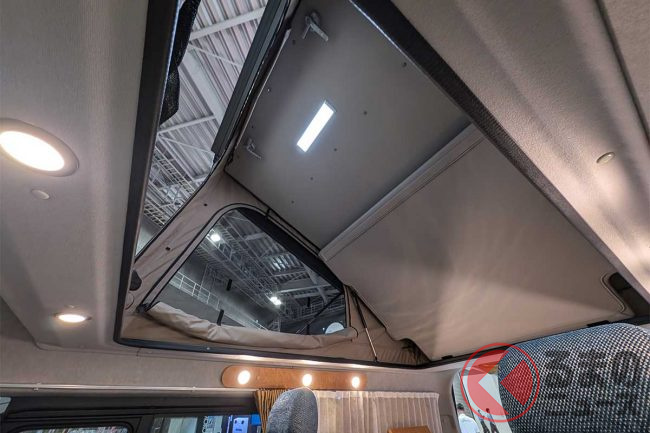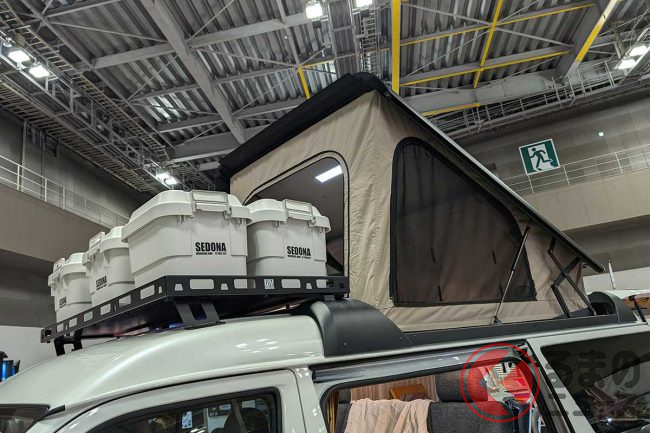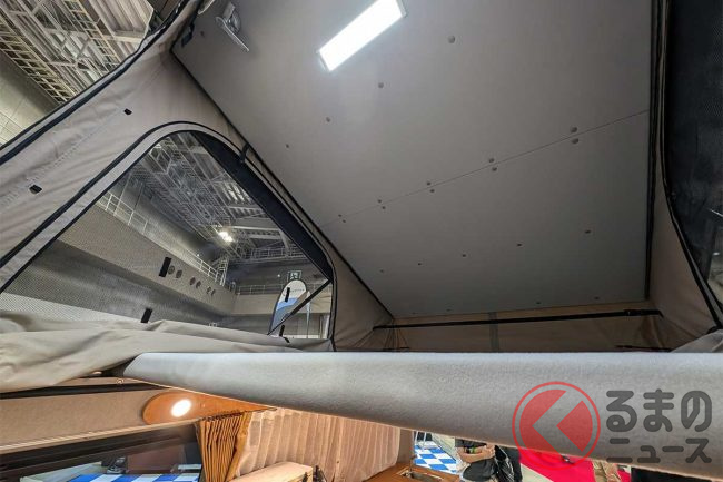 そしてもうひとつの見どころはルーフです。ポップアップ式の新製品「エアロフト」を搭載し、展開するとテントのなかに長さ1800mm×幅1000mmのベッド空間が誕生し、大人2名の就寝が可能です。